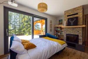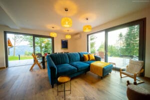 Na parterze znajduje się salon - kominek, kilka foteli, rozkładana sofa - powierzchnia spania 150x220cm - ekran z projektorem, Apple TV, Maxem i Disney+ - w pełni wyposażona kuchnia z wyspą - jadalnia - stół dla 12 osób – biblioteczka lokalna i trochę planszówek - gabinet/sypialnia - rozkładana sofa - powierzchnia spania 135x195cm - łazienka z prysznicem, umywalką i WC - sauna - kącik dla dzieci - ściana do rysowania kredą i zabawy magnesami - przedpokój z pralką i suszarką oraz zlewem gospodarczym - taras od strony południowej i zachodniej - ok. 50 m2 - a na tarasie leżaki i fotele w stylu westernowym