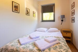 Na piętrze znajduje się sypialnia 1 z łazienką - łóżko (200x200cm) - pokój z balkonem - sypialnia 2 z łazienką - łóżko (200x200cm) - sypialnia 3 z łazienką - dwa łóżka (90x200cm )