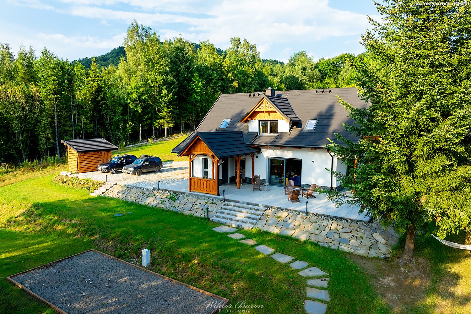 Nasz ogród to pół hektara ogrodzone solidnymi panelami. Dookoła nie ma innych domów tylko las i połoniny. Ta przestrzeń zapewnia całkowitą ciszę, spokój i prywatność. W ogrodzie znajdują się drewniany domek na palach do zabawy dla dzieci. Pod domkiem jest piaskownica, gdzie można się bawić nawet kiedy pada deszcz. Latem wystawiamy do ogrodu mały basen dla dzieci. Jest zadaszona przestrzeń grillowa z piecem do pizzy i tradycyjną kuchnią z fajerkami. Jest altana w pienińskim stylu, idealna do wspólnego spędzania czasu. W ogrodzie jest opalana drewnem bania. Jest też miejsce na duże ognisko z siedziskami dookoła. Nie zabrakło też kilku dwuosobowych hamaków rozwieszonych pomiędzy drzewami. Dodatkowo zbudowaliśmy w ogrodzie bulodrom do gry w pétanque. W naszym ogrodzie Wasze zwierzęta poczują się jak na wakacjach zaplanowanych również dla nich bo wybiegają się tak, że nie będzie im już potrzebny spacer po górach.